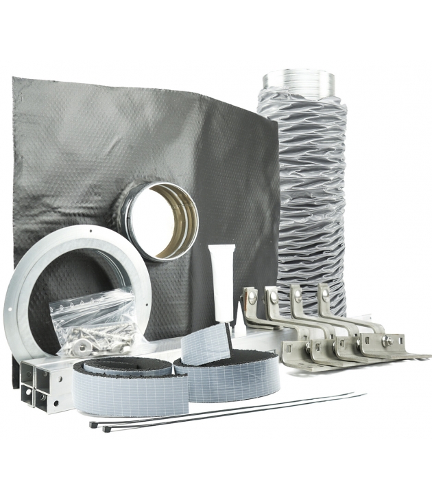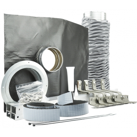 2 st. Stativset 30-60 grader 1 st. Flexslang 125 x 750 2 st. Remsor självhäftande isolering 2 st. Slangklämmor 60-175 1 st. Takgenomföring Typ 1-125 svart (450 x 620 mm) 1 påse Skruvar och tryckfördelare till tak 1 st. Aluflexslang 125 x 1250 (sträckas) 1 st. Skjutmuff 1025 x 250 1 st. Monteringsbeskrivning